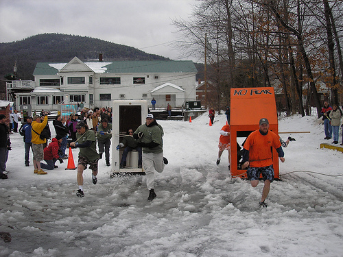 No way- I'm not slammin these men - I'm new to the board and sick of cold myself. Up here, if we want to fish Nov-April the options are cold and colder. I can assure you all the fat girlz come out in the winter too. Once in a while, although seldom, we get a glimpse of a bare ankle or neckline -- "wow, awesome, check out the shoulder on that one!" But I will say -- I got no heater and dont happen to fish with anyone that uses one. We manage to make the best of it I guess. This is our "Outhouse racing team" Yep - its true--we're all class in Upstate NY.