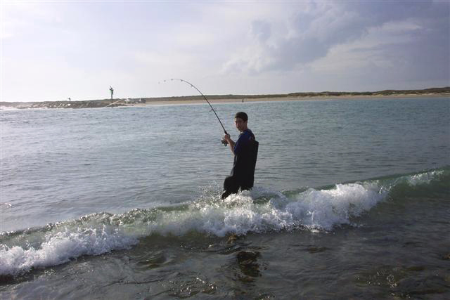 I note a couple of the Extreme Coast Fishing crew working their small rods on the jetties casting plastic or chrome artificials. One of them finally gets a good rod bend and I realize it’s a Rat Redfish. So Austin and I shift gears quickly and rig up. We skip hopping the rocks since the tides running out and the only real good spot is occupied by the Extreme Fishing crew and one boat riding the hook. I noted two rock points that cut out into the channel, back away from the jetties and I tell Austin let’s wade the pair of points and work the down current side. Our tactic is to cast beyond the points and work the spoons just above the rocks following the angle of the point. I note "excited water" just on the down current side of the points and the strong current certainly provides a "rock rap" bounce to the surface, easily identifying potential snag points and areas where reds will sit in ambush. The water is absolutely clear and I decide to toss ¾ ounce Johnson Sprite Chrome spoons to limit break-offs around the rocks. Jigs would be too hard to fish here, casting into a stiff breeze, lots of rocks underwater and working a swinging bait presentation in a strong current. Austin’s first cast is fully rewarded.