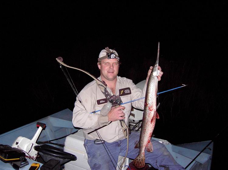 when he took two shots at a really big gar, he missed both times and handed the bow to me. i shot 13 times at this same gar hit it twice and finally boated it.