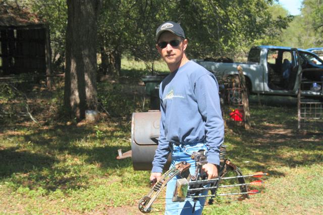 I agree that it was a blast and I'm ready for next year already. Awesome pixels Rob as usual. My days at the Capote had me arriving last Wed evening around 6:30 pm. John was in his usual spot: on the front porch and was wondering where I had the beer. Anyone who knows John can appreciate this humor! We sat down and steadily poured back the adult beverages and had good conversation. Wes' cousin Allan showed up later stating he saw a few deer but nothing shot. Thursday morning found me in a pop up on John's feeder. Early I hear several deer walking around behind but obviously they did not like me in the popup and kept blowing at me. Nothing until around 8:45am when a doe and a fawn walk in about 6 yds away eating corn but the larger one will not turn to give me a shot. Suddenly a third doe shows up even closer and I let her have it with a Rocky Mountain Gator expandable. She took off about 30 yds and stood around a while and I saw I hit her a little far back. I hoped the 2" cutting blade would do it's job which it did. Some reason the only picture of my deer that is showing up on my camera is of the BH damage which is a little graphic for this site so I'll leave it off. Thursday afternoon found me dove hunting with John and what a great experience other than the dove did not cooperate but took some wild shots and missed some easy ones. John has a little different flare to his dove hunting style which I happened to enjoy!