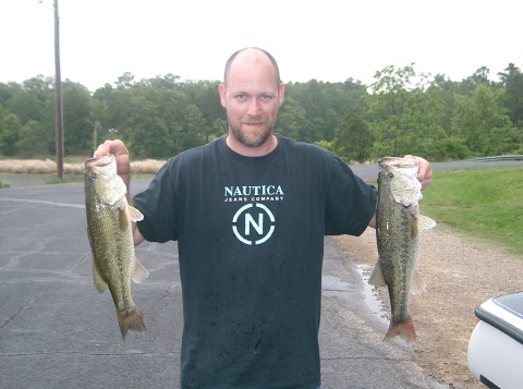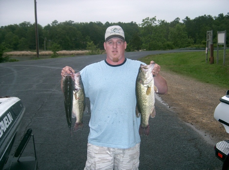 Here are a few pics from our club tourney on Pat Mayse this weekend. It was windy and storming but me and my partner still put a pattern together good enough for thirty two pounds of fish between the two of us. I partner weighed 15.13 and I weighed 16.93 lb sack but it still wasn't good enough for first. The leader weighed in a 21 lb sack with a 7.5 pound kicker! Hopefully my string will hold up for a second place finish, the rest of the club finish up today. Our pattern consisted of pitching soft plastics on wind blown main lake and secondary points in 20- 30mph winds. Stumps and pads were usually present. Don't know what the big bags pattern was but he wasn't fishing where we were. First pick is of me and my 5.29 lb. fish and a couple others and the second is of my partner Jimmie and his two best fish, twin 4.3 pounders. The last is of Mark and his big fish.